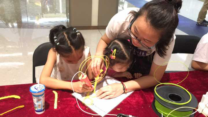 “3D·啟智·童(同)樂”展區(qū)主要結(jié)合“六一”主題和三祺廣場“新教育”的區(qū)位優(yōu)勢,開展面向兒童的3D打印科普親子體驗活動。無論是3D打印筆區(qū)域、3D打印機區(qū)域都內(nèi)容豐富,過程有趣,吸引了絡(luò)繹不絕的人群圍觀,尤其是3D打印煎餅和巧克力成了大家的注腳點,邊看邊嘖嘖稱奇。孩子們可以體驗DIY美食的樂趣,可以實現(xiàn)畫出立體的圖畫,傳遞了科普的知識性、實用性和趣味性,大人和小孩樂在其中,從而激發(fā)了孩子們愛思考、樂創(chuàng)造、勤動手等的良好品質(zhì)。