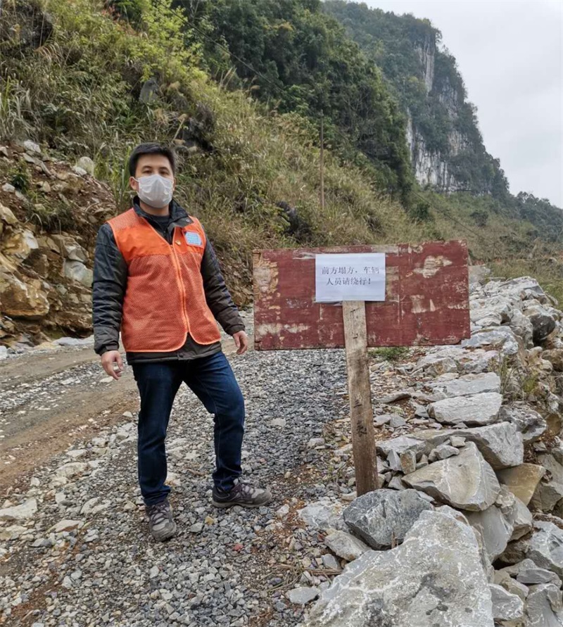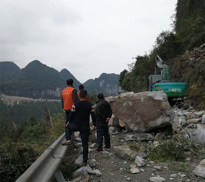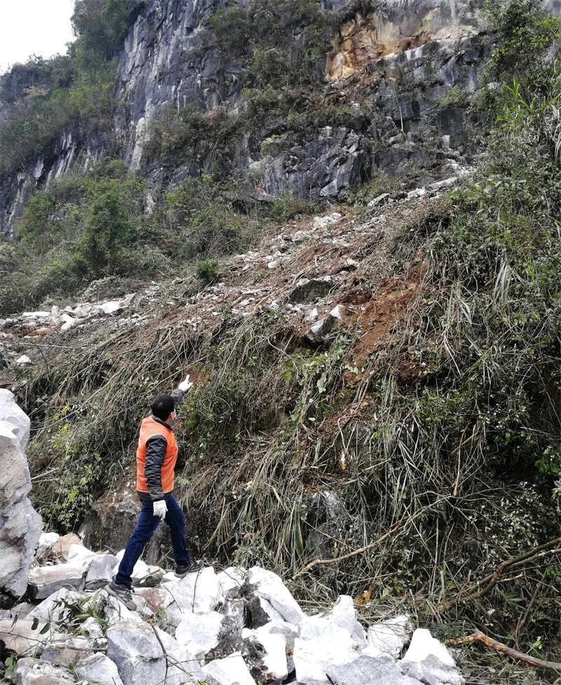 情況危急,覃敢立刻放下手中的工作,與3名工作隊員匆忙前往塌方地點。原來這是由地質(zhì)災(zāi)害引發(fā)的山體崩塌,山上滑落的石頭已將道路埋沒,受阻路段大約有10米。在詳細偵查塌方現(xiàn)場情況,確認現(xiàn)場無人員傷亡后,覃敢心中松了一口氣。
