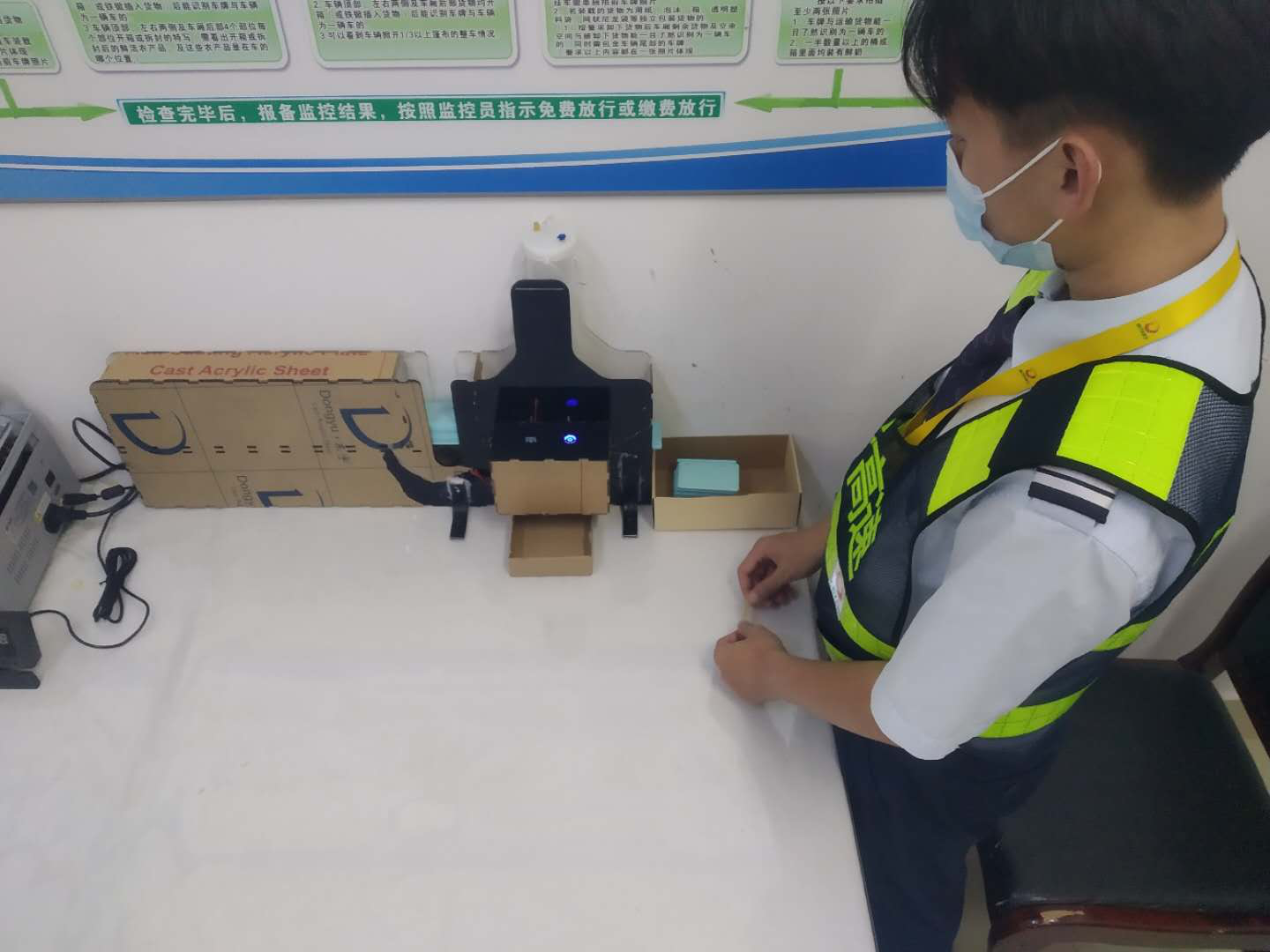 疫情期間,CPC卡的酒精擦拭消毒是收費(fèi)員的新工作內(nèi)容,現(xiàn)也成為了常態(tài)化疫情防控的工作任務(wù)。人工擦拭消毒效率低,占用時(shí)間較多,為提高效率,雙方合作研發(fā)了CPC卡自動(dòng)消毒機(jī),該產(chǎn)品可實(shí)現(xiàn)自動(dòng)送卡,擦拭酒精等功能,每小時(shí)可消毒600張CPC卡。