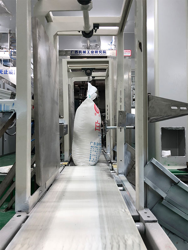 糖廠使用套裝式內外袋全自動包裝碼垛機器人生產線現場