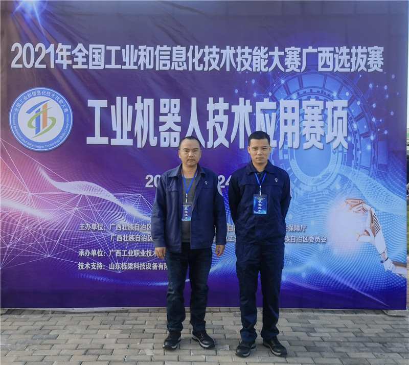 機械院李永成、李修明組成的競賽隊伍,參加了由自治區工業和信息化廳等5部門聯合舉辦的2021年全國工業和信息化技術技能大賽廣西選拔賽。本次為兩人首次搭檔參加該類型比賽,經過激烈角逐,從工業機器人系統維護員(工業機器人技術應用)賽項職工組8個參賽隊伍中脫穎而出,獲得了總分第一的好成績。