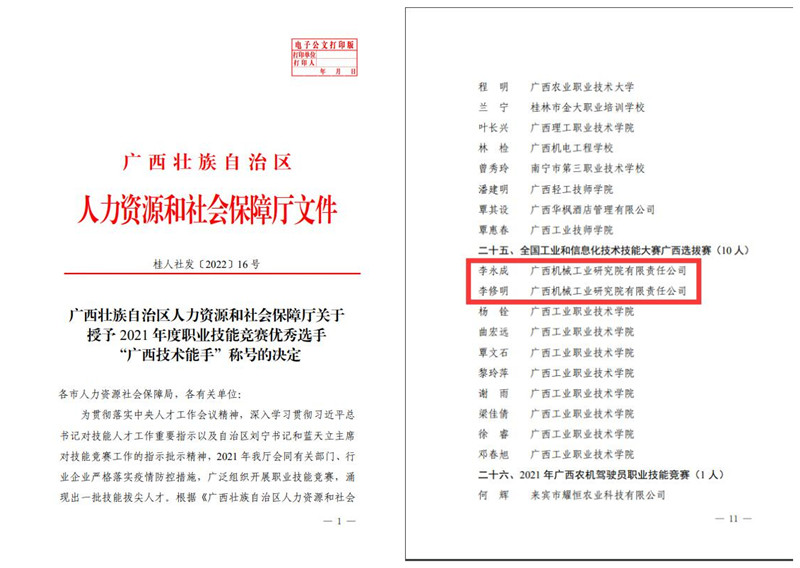 【“技術尖兵”擔當落實創優】機械院2人榮獲“廣西技術能手”稱號