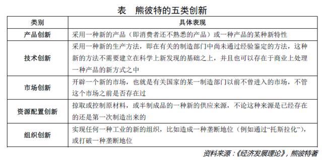 在熊彼特看來,創新包括五種情況,分別為產品創新、技術創新、市場創新、資源配置創新與組織創新,具體如下表: